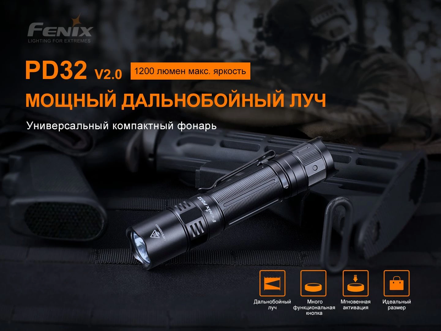 Ручной тактический фонарь Fenix PD32 V2.0 (1200Лм, 395м, IP68, аккумулятор не входит в комлект)