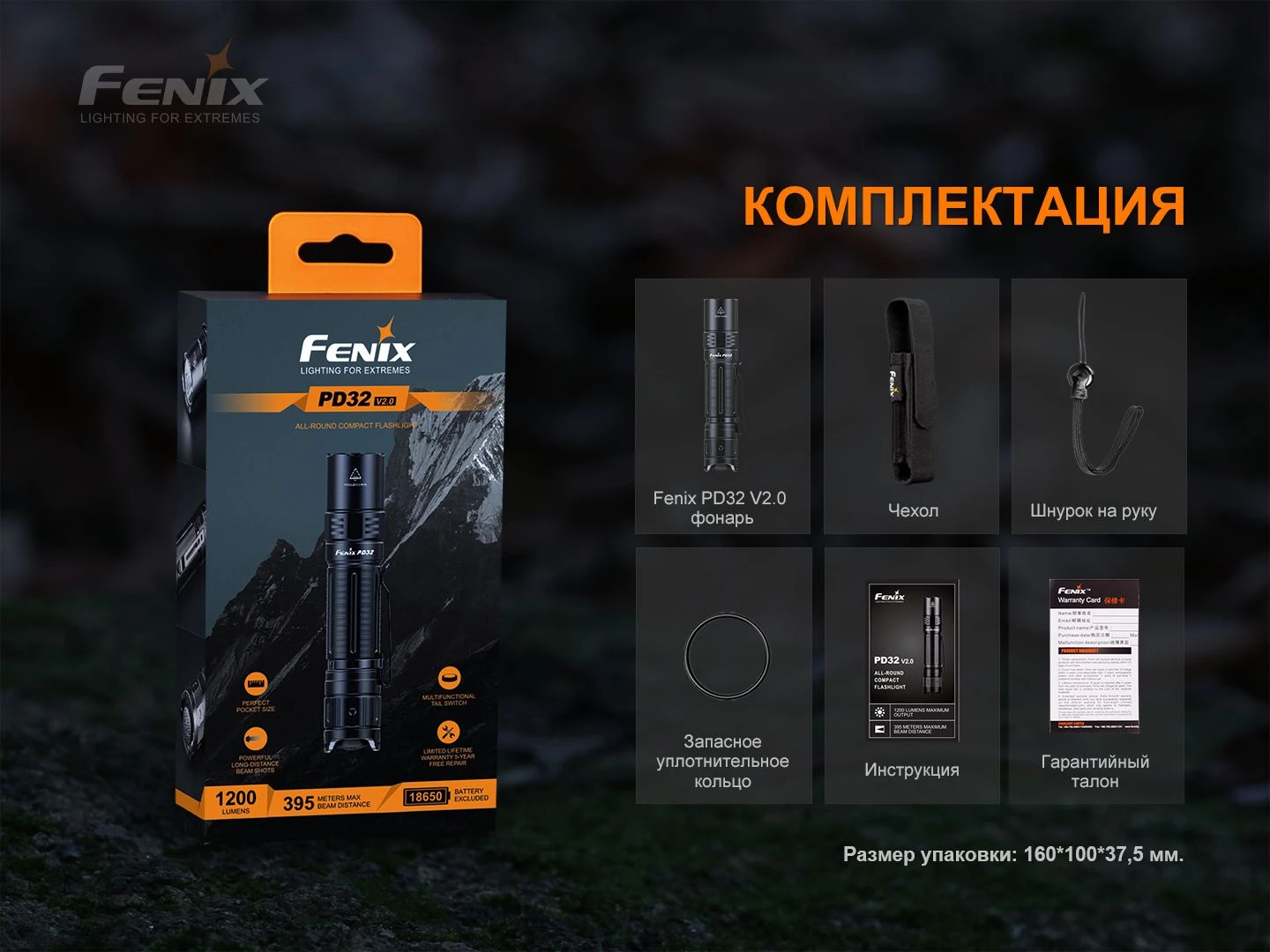 Фонарь PD32 V2.0, удобный ремешок на руку, клипса, чехол, сменное уплотнительное кольцо, гарантия, инструкция, АККУМУЛЯТОР не входит в комплект