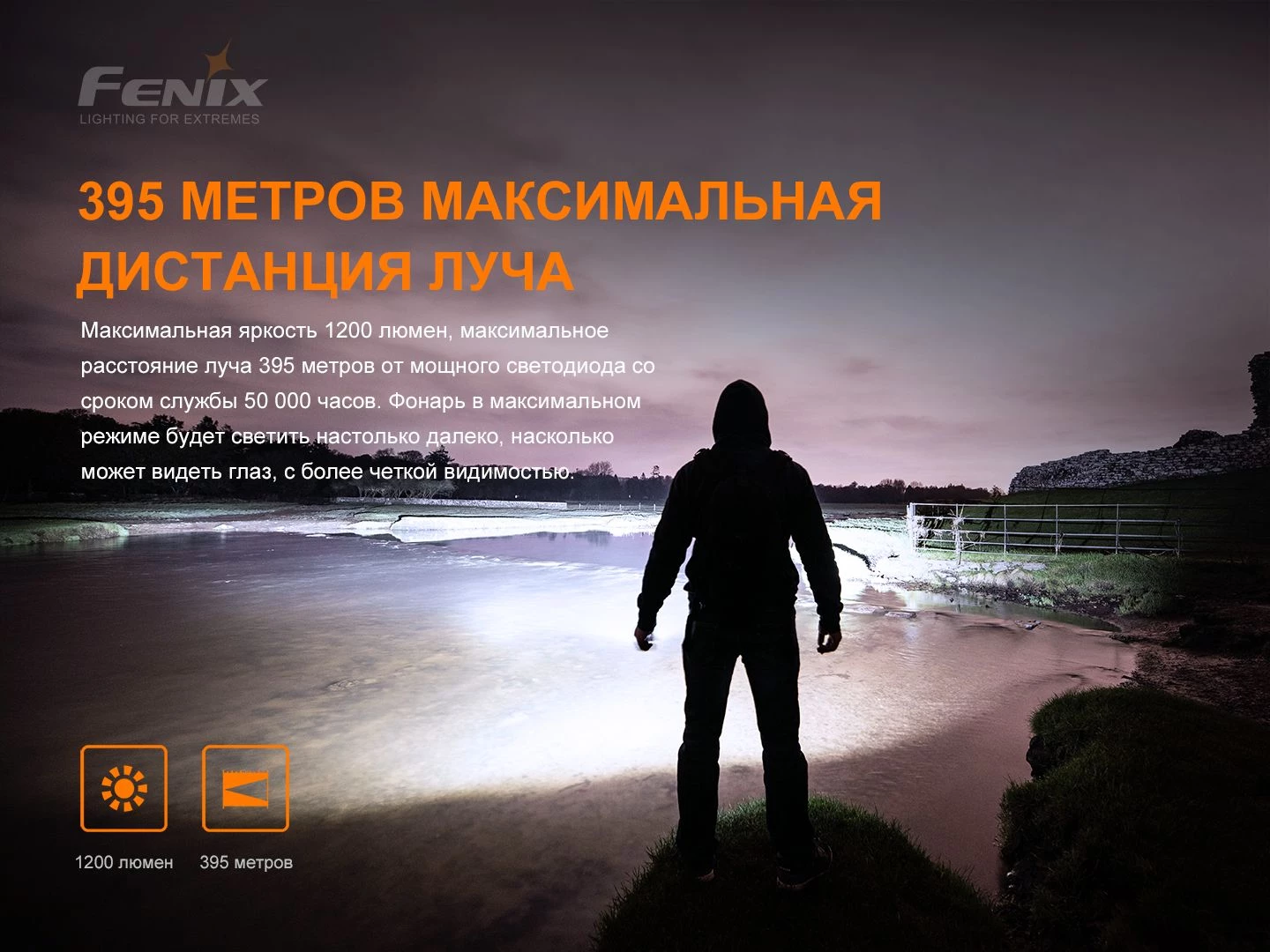 - Мощность до 1200 люмен и дальнобойность до 395 метров;
