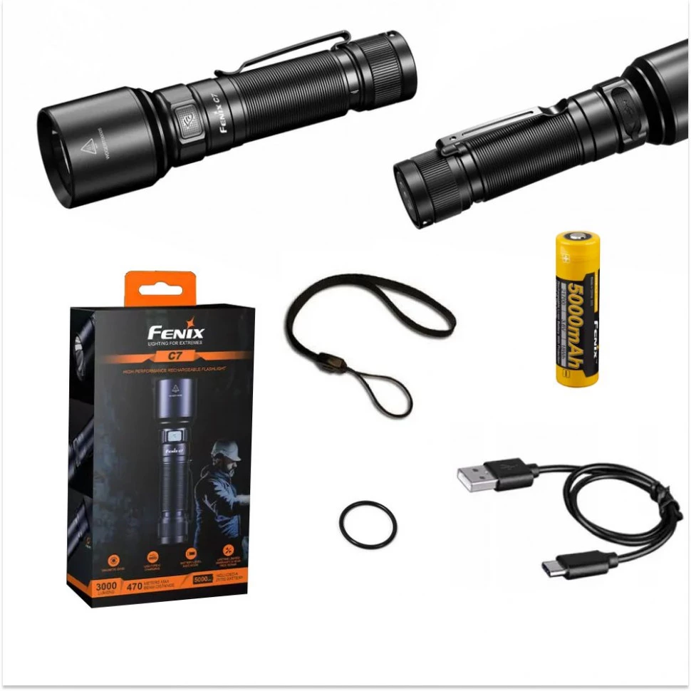 Фонарь Fenix C7 – высокопроизводительная ручная модель для промышленного обслуживания и применения. Зарядка осуществляется при помощи USB Type-C с включённой литий-ионной батареей ёмкостью 5000 мАч. Способен давать наибольшую яркость освещения в 3000 люменов в турбо-режиме при дистанции луча до 470 метров.