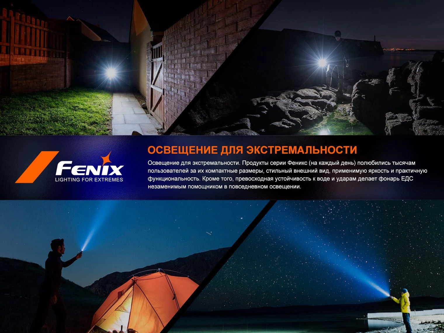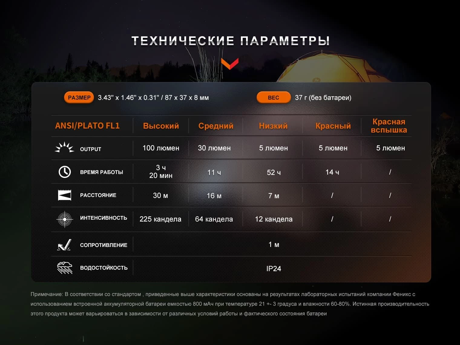 Примечание: в соответствии со стандартами ANSI/PLATO FL1, приведенные выше характеристики основаны на результатах, полученных компанией Fenix в ходе лабораторных испытаний. Опыты провели с использованием встроенного 800mah аккумулятора при температуре 21±3°C и влажности 50%-80%. Фактические характеристики этого продукта могут варьироваться в зависимости от различных условий внешней среды и применяемого аккумулятора.