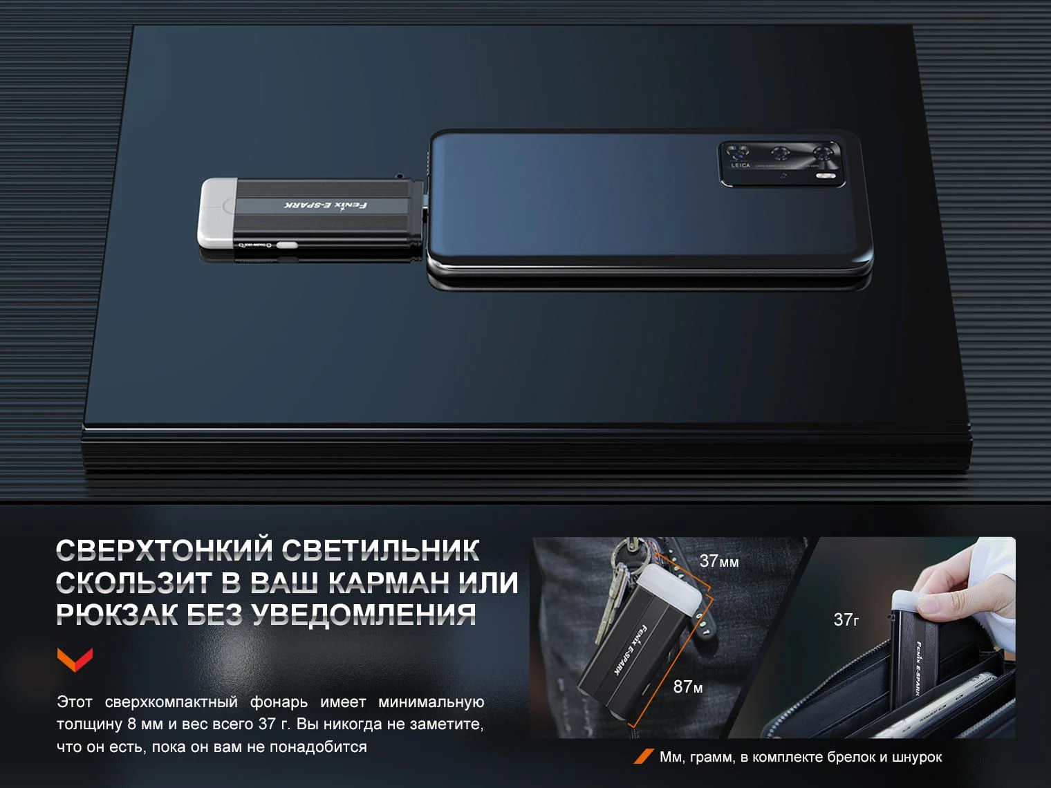 Комплектация: Fenix E-SPARK наключный фонарь, USB Type-C зарядный кабель, цепочка для ключей, темляк, руководство, гарантийный талон.