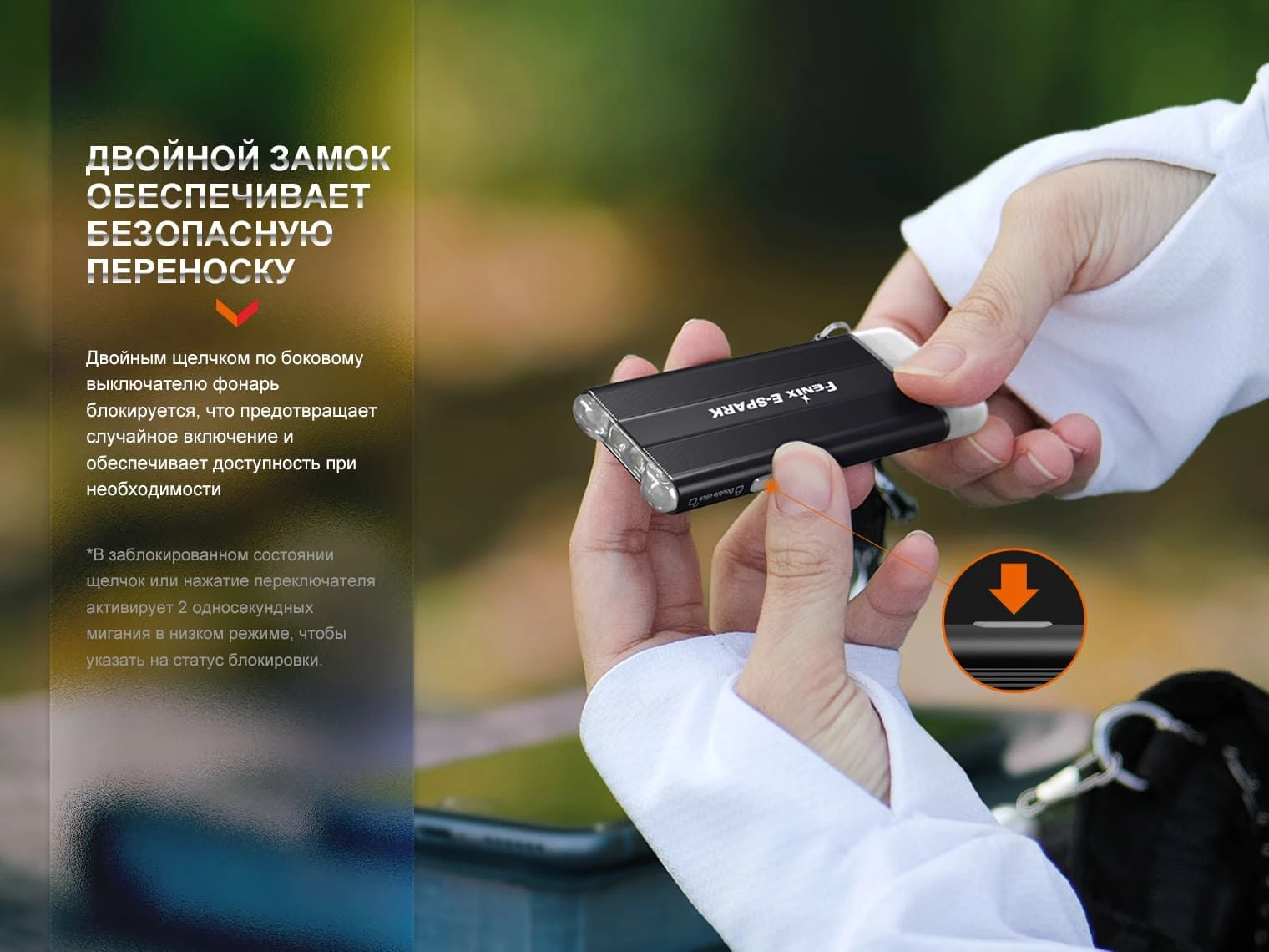 Блокировка: когда фонарь разблокирован и выключен, дважды щелкните переключатель в течение 0,5 секунд, чтобы заблокировать. Фонарь дважды мигнет на минимальной яркости, указывая на переход в режим блокировки.