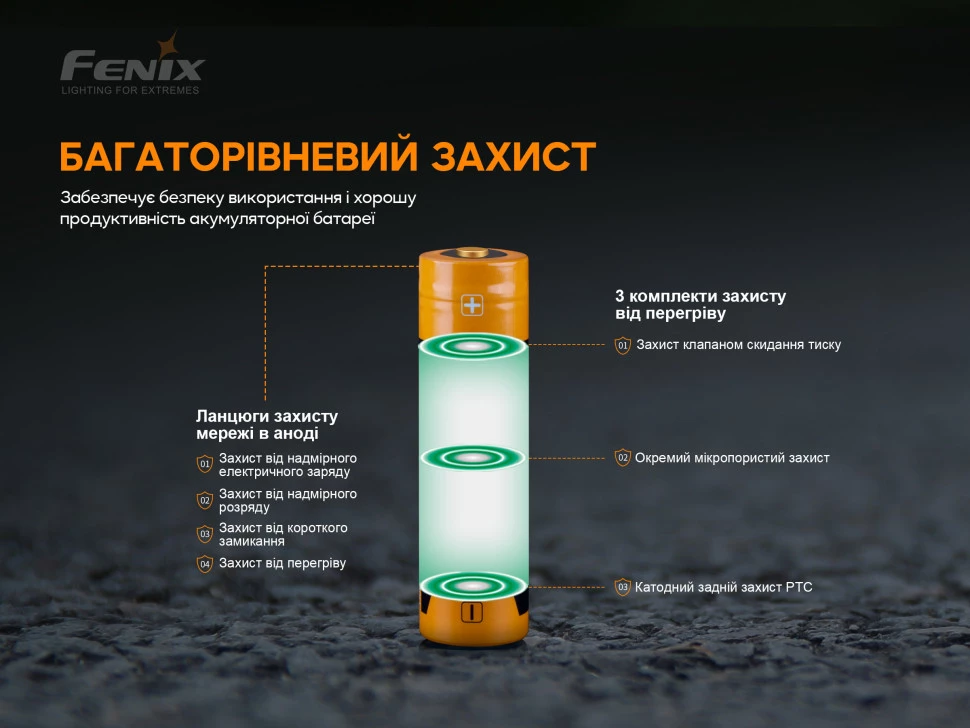 В аноде Fenix ARB-L18-3000P присутствует защитная плата, которая обеспечивает трехуровневую защиту от перезаряда, переразряда и перегрева во время длительной эксплуатации. На случай короткого замыкания предусмотрены несколько отверстий, через которые сбрасываются избытки образовавшегося газа во избежание раздувания аккумулятора – распространенной причины взрыва элементов питания. Данные отверстия находятся в верхней части корпуса и покрыты защитной пленкой, предотвращающей попадание пыли и капель воды внутрь конструкции.