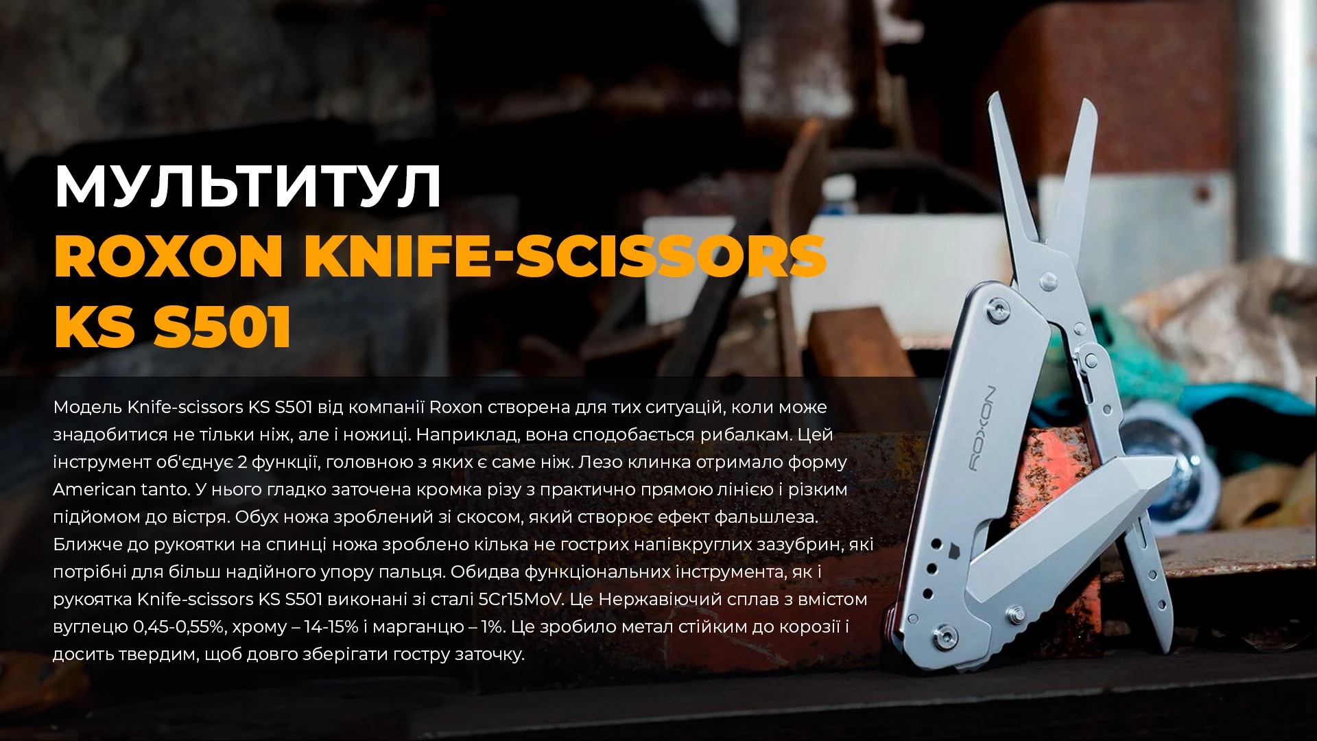 Обидва функціональних інструменту, як і рукоятка Knife-scissors KS S501 виконані зі сталі 5Cr15MoV. Це Нержавіючий сплав з вмістом вуглецю 0,45-0,55%, хрому – 14-15% і марганцю – 1%. Це зробило метал стійким до корозії і досить твердим, щоб довго зберігати гостру заточку. За ним не складно доглядати, адже досить стежити, щоб інструмент після використання зберігався сухим і чистим.