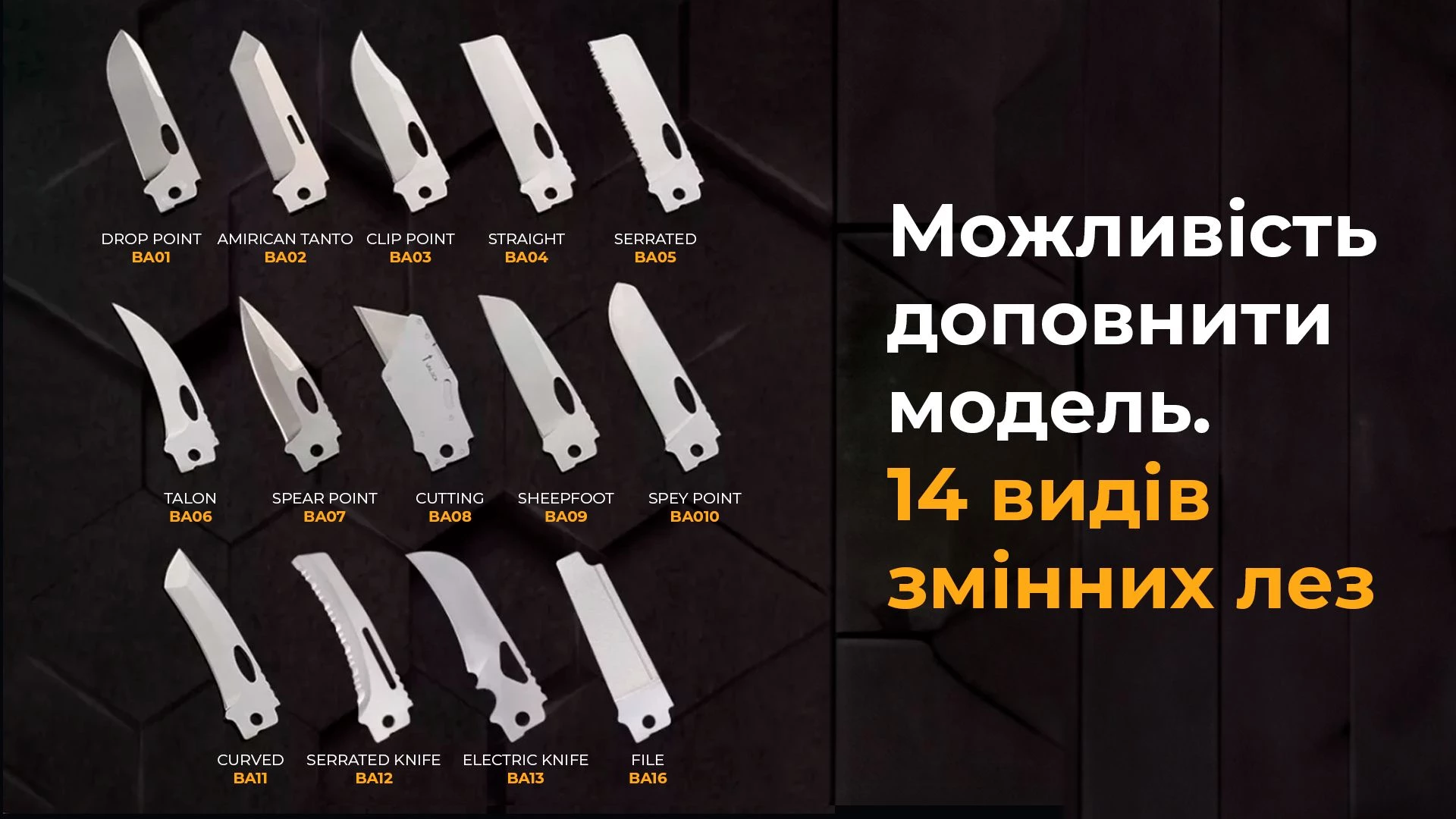 КонфігураціяВідкривачка для пляшок, Лінійка, Шило, Ножиці, Напилок, Пила по дереву, Пасатижі, Ніж, Викрутка, Консервний ніж