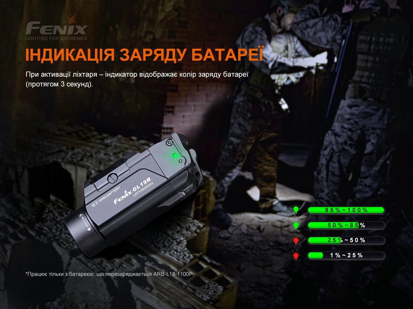 Ліхтар Fenix GL19R це потужна акумуляторна модель для тактичних цілей. Вона була розроблена спеціально для того, щоб підвищувати видимість і можливості прицілювання при стрільбі. GL19R досить невеликий за габаритами і практично неруйнівний, дає інтенсивний білий світ яскравістю 1200 люменів. Відстань дії променя становить 210 метрів. Його можна швидко зафіксувати як на універсальній направляючій, так і на планці Пікатінні за допомогою запатентованого важеля QD. Двосторонні задні кнопки гарантують Миттєве управління одним пальцем короткочасного або постійного включення. Режим стробоскопа можна активувати довгим натисканням при включеному світлі, щоб допомогти вам контролювати ситуацію.