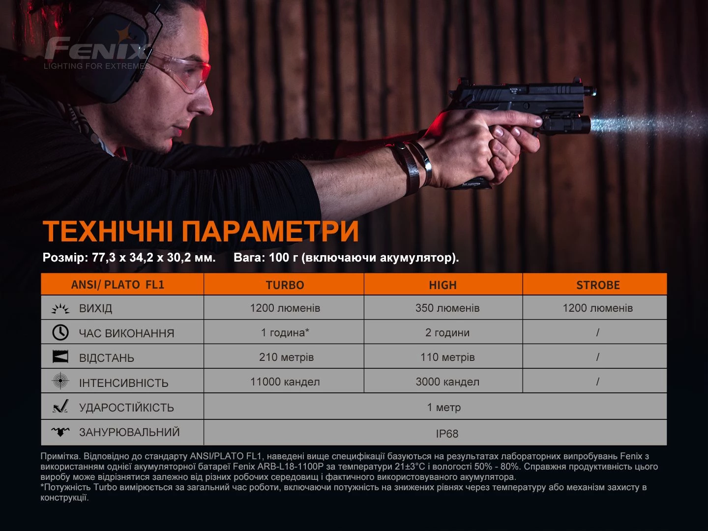 Враховуйте, що ці параметри роботи моделі були отримані в ході проведення дослідів в лабораторії. Де використовувався акумулятор літій-іонний Fenix ARB-L18-1100p при температурі 21 +-3 градуси Цельсія і вологості повітря 50% -80%. Фактичні параметри світіння ліхтаря можуть відрізнятися в залежності від всіляких умов зовнішнього середовища і того акумулятора, який використовується.