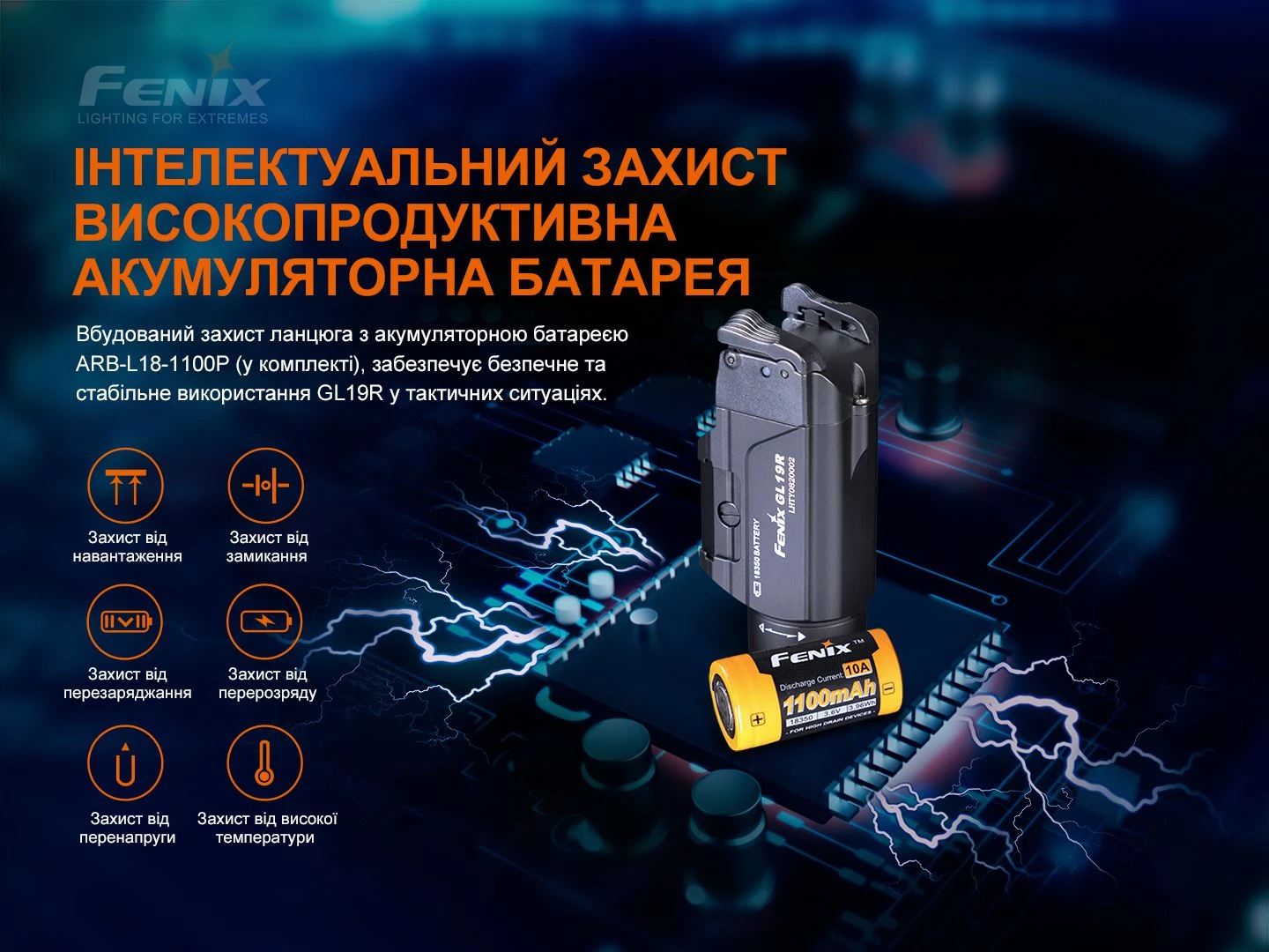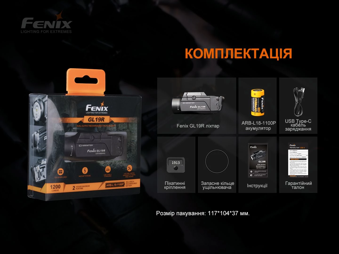 Ліхтар моделі Fenix GL19R, літій-іонний акумулятор Fenix ARB-L18-1100p, кабель для зарядки USB Type-C, планка Пікатінні, запасне кільце ущільнювача, керівництво до застосування, талон гарантії.