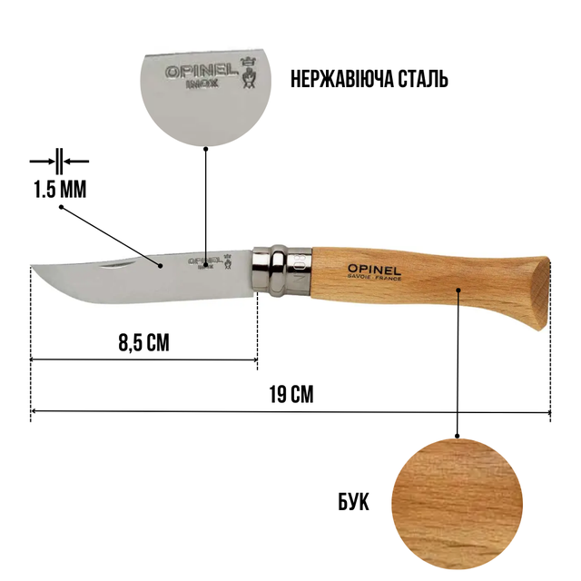 Ніж Opinel VRI 8 є яскравим прикладом поєднання класичного дизайну і нових технологій виробництва. Клинок ножа Opinel VRI 8 виготовлений з нержавіючої сталі марки Sandvic 12С2 і пройшов спеціальну термічну обробку, яка забезпечує твердість матеріалу на рівні 57-58 HRC.
